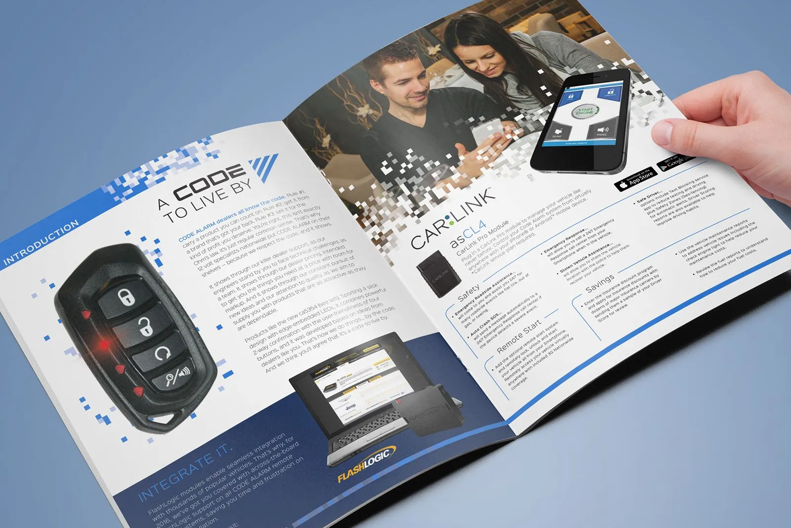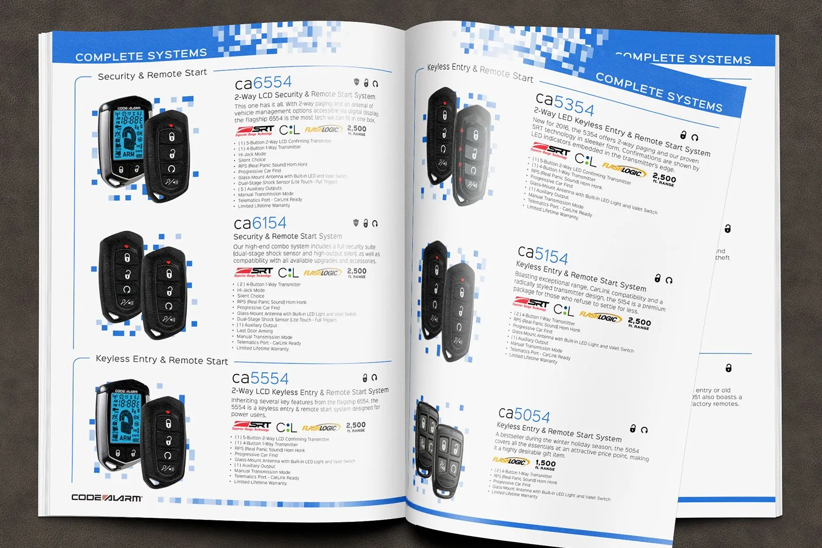 Representing their 2016 product line, this literature I did for Code Alarm debuted at the 2015 SEMA show in Las Vegas. Its ambitious “bitmap” theme is a radical departure from the norm, making it irresistible to curious eyes. Inside, evocative intro copy wins the hearts of retailers, talking shop and echoing thoughts that are unique to them.