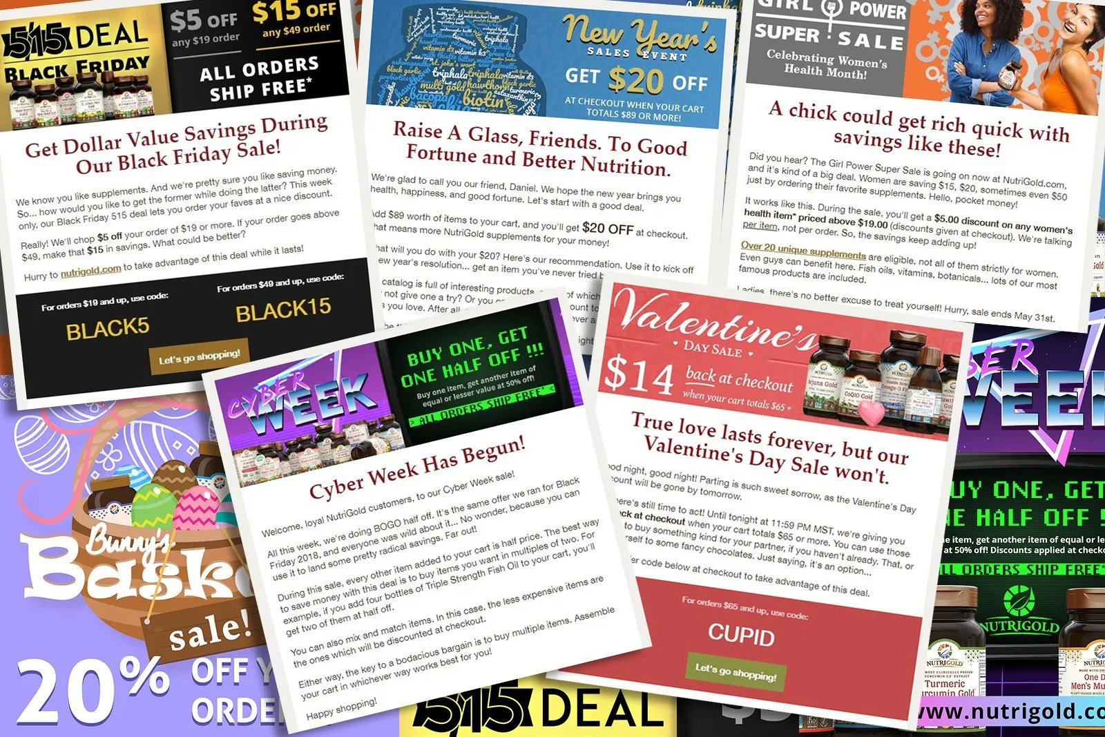 This Easter-themed promotion, during the week before Easter, offered 20% off orders of six or more items. The campaign’s visuals featured pastel colors, Easter eggs, and bunny rabbits. The messaging coerced customers to “gather” their supplements as if on an Easter egg hunt.