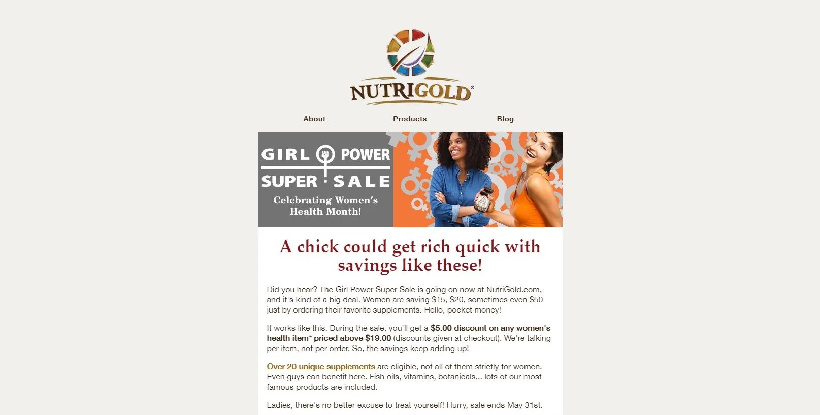 This Mother’s Day-adjacent campaign offered $5 off women’s health items over $19. “Women’s Health” was a global meta tag on our website, applied to products including but not limited to women’s multivitamins. Any product with the tag qualified for the promotion.