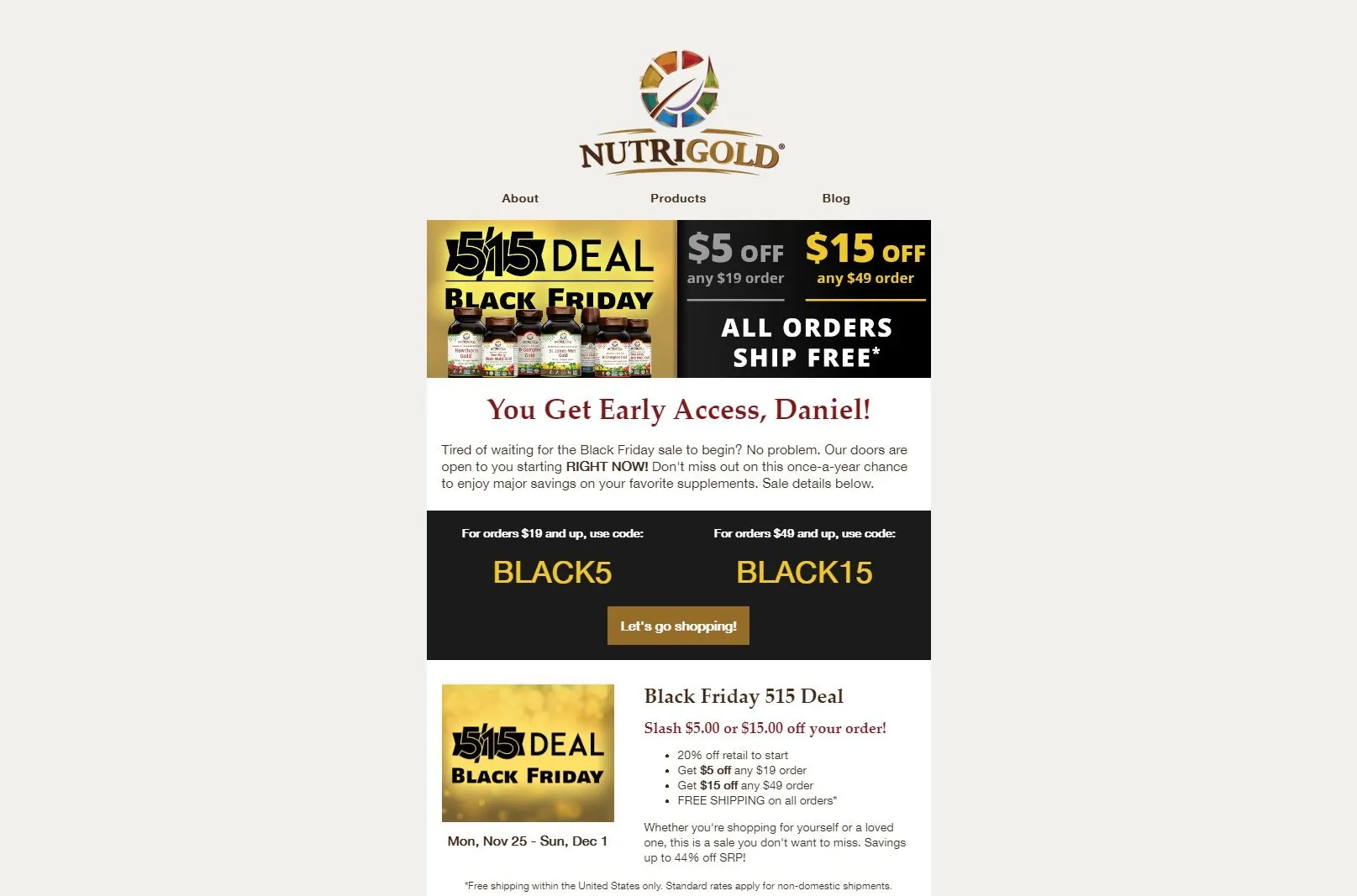 This promotion, spanning the week leading to Black Friday, featured two coupon codes: BLACK5 ($5 off orders of $19+) and BLACK15 ($15 off orders of $49+). Both included free shipping regardless of order total. The campaign’s aesthetic was sophisticated, using a gold-and-black color scheme and a “515” logo inspired by the popular TV show “Deal or No Deal.” The messaging had a money-hungry vibe, enticing customers to “cash in.”