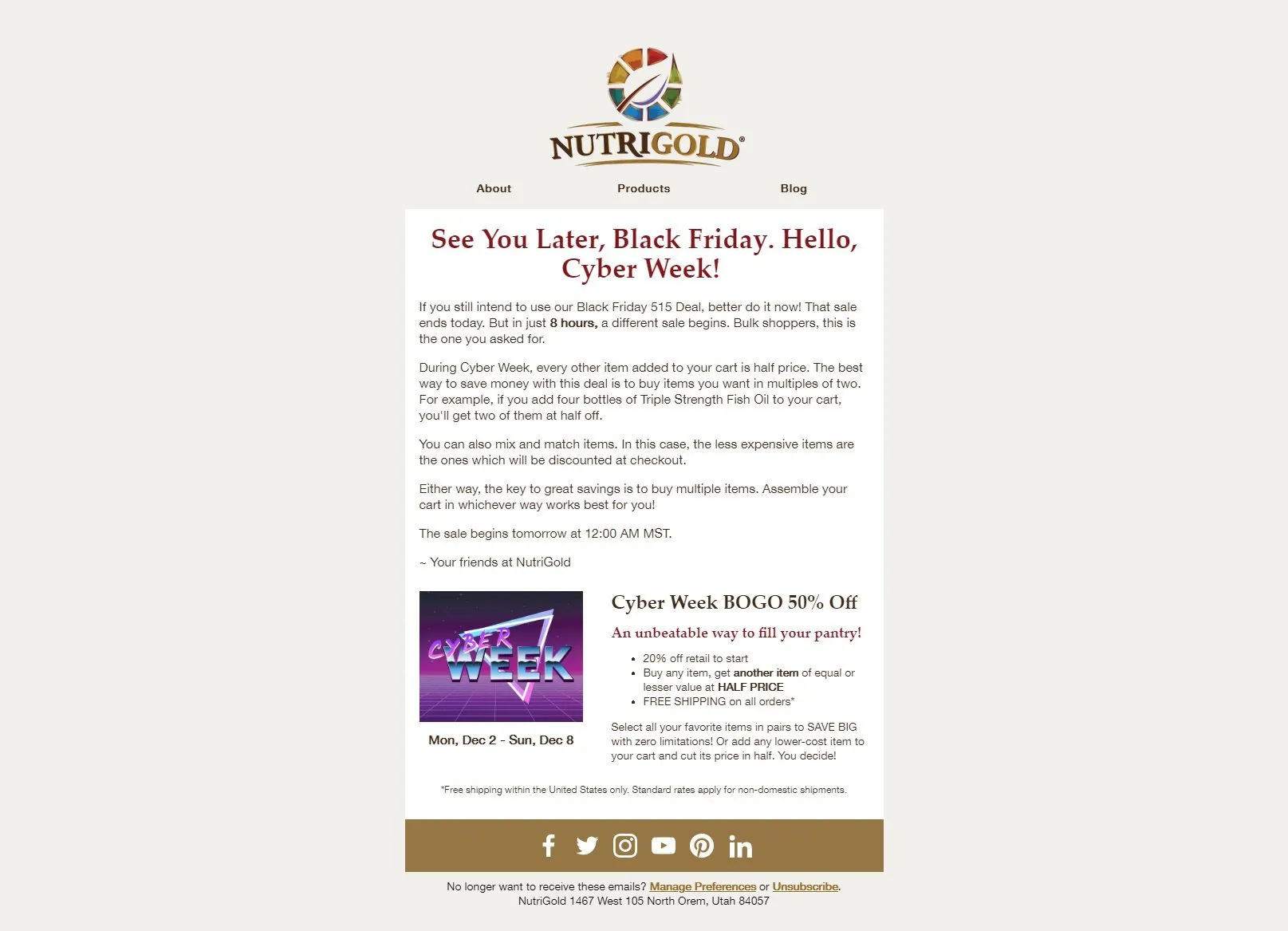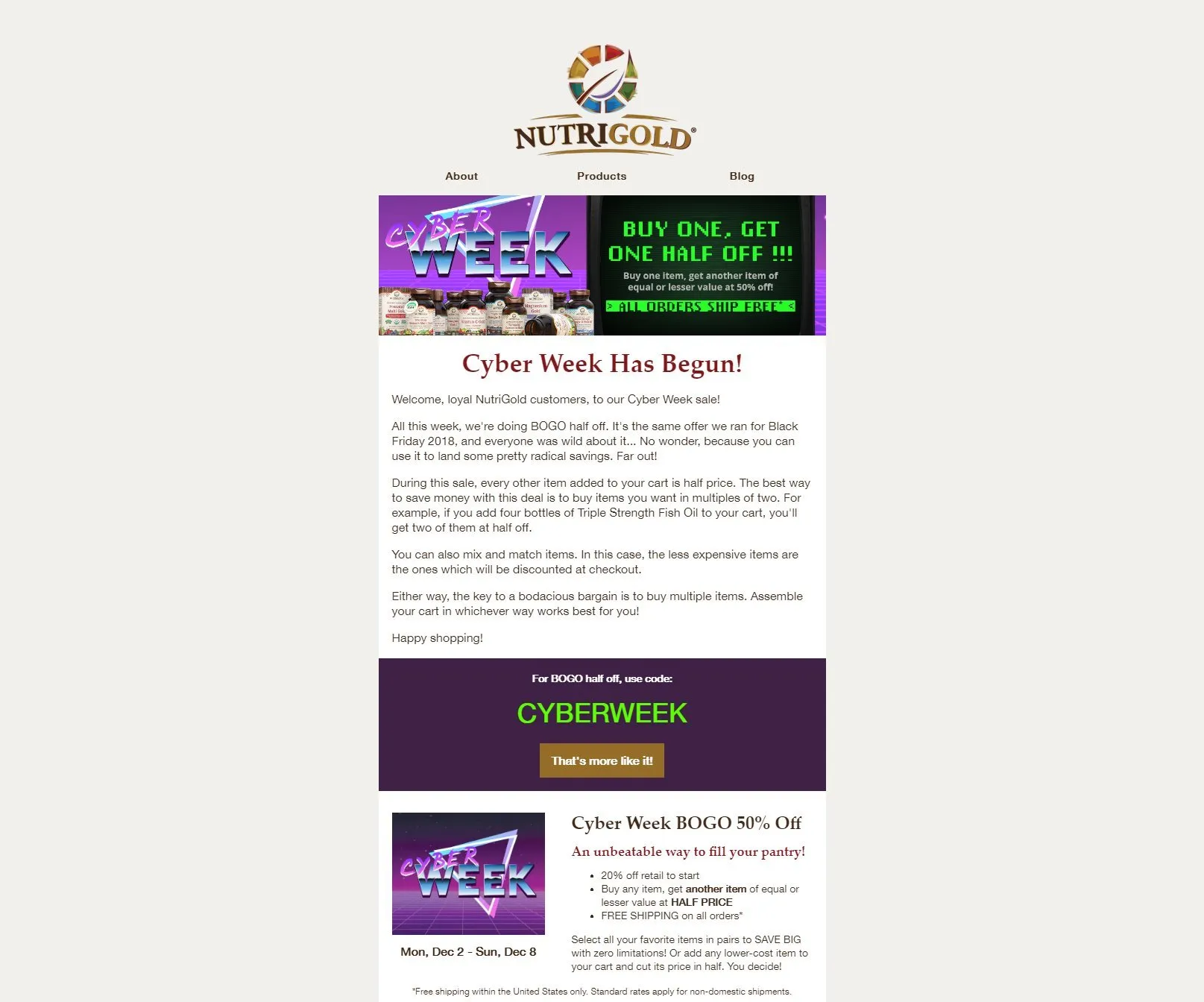 Immediately following the 515 Deal, Cyber Week ran for the week of Cyber Monday. The offer was “Buy any item, get another item of equal or lesser value at half price,” combined with free shipping on all orders. The shopping cart automatically applied the discount to the lower-priced items in the cart, based on the presence of equally or more expensive items. For example, someone shopping for two $50 items and two $30 items would have the two $30 items discounted to $15, leading to a stotal spend of $130.
