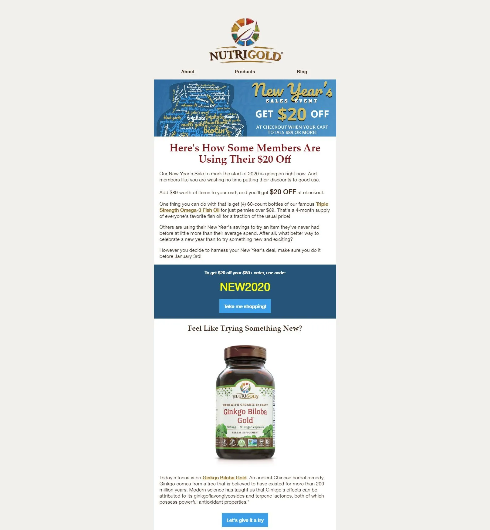 This promotion, running the first week of January, offered $20 off orders of $89 or more. Crucially, this promotion did not include free shipping. This motivated customers to add other items to their carts to reach the standard free shipping threshold, driving discovery of new products. The visual theme was blue and gold, with word clouds assembled from supplement names. The messaging focused on New Year’s resolutions, encouraging people to try new things, as product discovery was a major campaign goal.