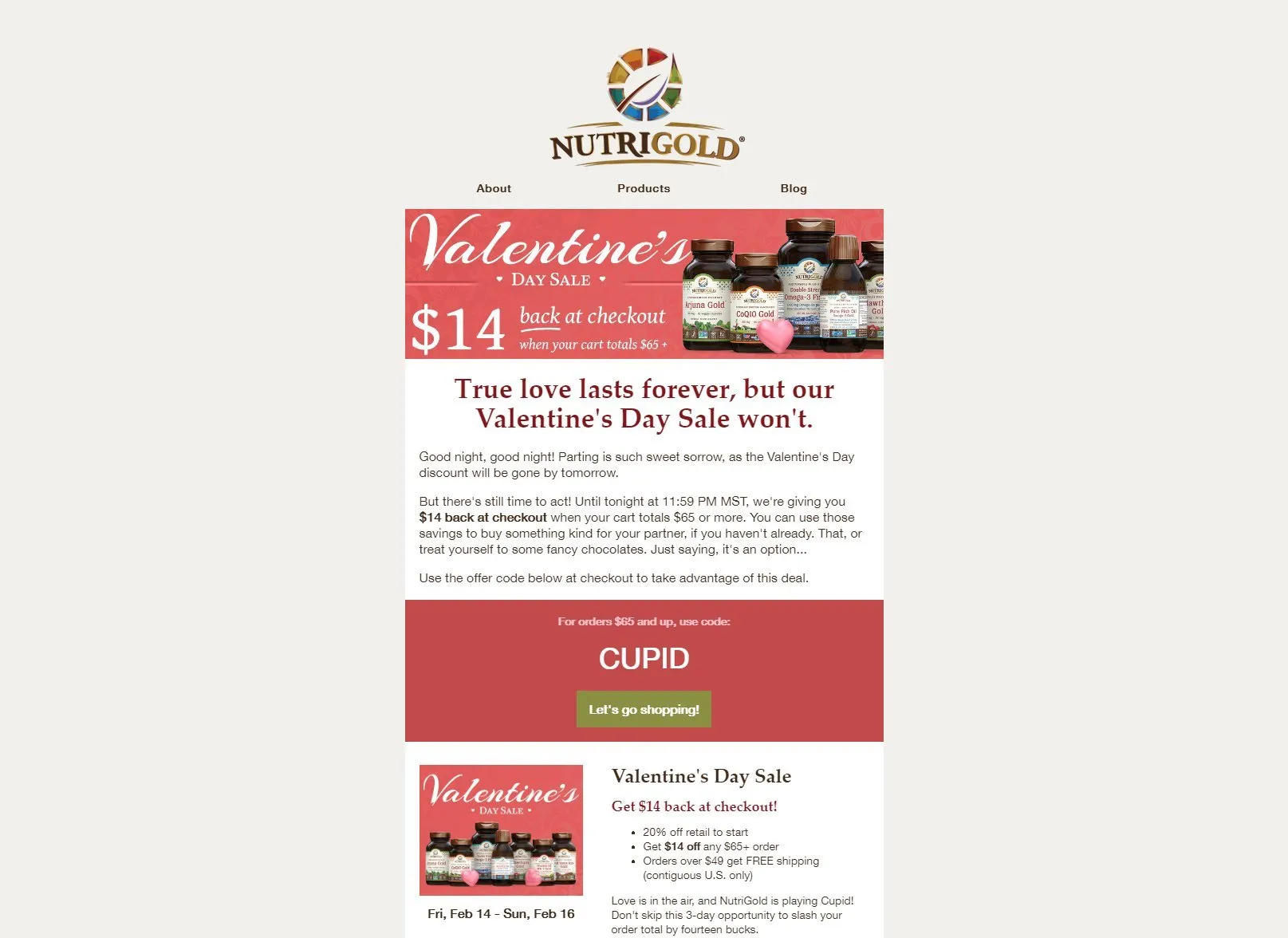 This week-long promotion, surfacing on Valentine’s Day, offered a $14 rebate on orders of $65 or more. The $14 tie-in with the February date added a thematic element. As usual, we anticipated and accepted the potential for split purchases.