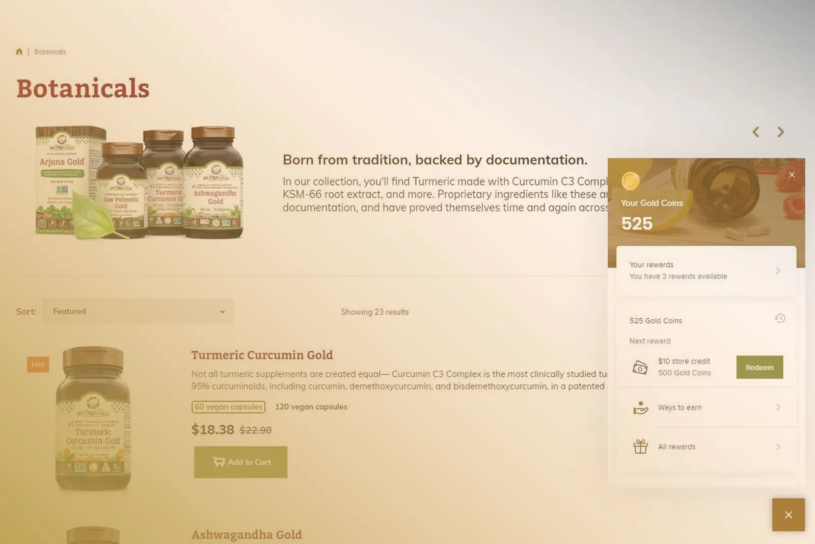In 2020, building on the success of the “Members-Only Coupon” program, I launched the “Gold Coin” program, powered by the Smile plugin for Shopify and supplemented with custom front-end code for a tailored user experience. This new program introduced a loyalty points currency, requiring careful consideration of a balanced points system. The challenge was to make the points program as, or more, appealing than the consistent monthly coupon. Ultimately, I seamlessly integrated both systems, creating a unified “Gold Coin” program that combined the predictable value of the recurring coupon with the dynamic rewards of a points-based system. This hybrid approach provided multiple avenues for customer engagement and reward, further strengthening customer loyalty and driving sales.