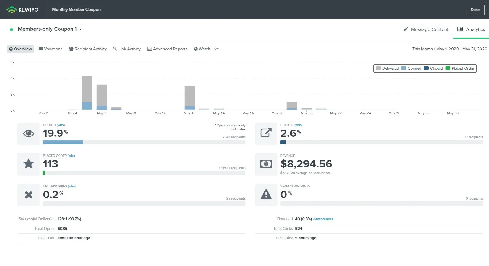 Customers who subscribed to our email newsletter automatically enrolled in the program, receiving a 20% off coupon every 30 days, delivered on their subscription anniversary. These coupons, valid for two weeks, encouraged prompt action. A series of three reminder emails, each with unique and engaging copy (including smart emoji usage and a distinct brand personality), were triggered if a coupon remained unused. To prevent email fatigue and maintain a sense of freshness, I developed a large library of email variations for both the initial coupon and the reminders, with the automation randomly selecting which version to send. This program proved incredibly effective, eventually driving a significant portion of daily sales and establishing a strong foundation for customer loyalty.