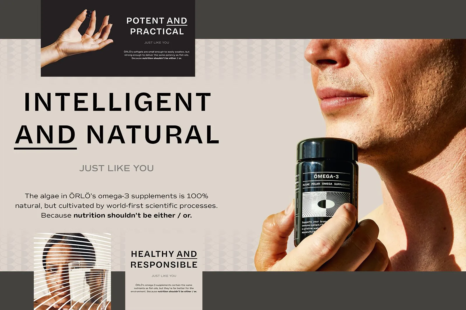 The core message, built around the word “and,” highlighted how Orlo delivers supplements that are both potent and practical, intelligent and natural, healthy and sustainable. Campaign copy, like “Potent AND practical, just like you,” directly addressed consumer frustration with the “either / or” dilemma of other supplements, reinforcing Orlo’s commitment to providing the best of both worlds. “Because nutrition shouldn’t be either / or” became a key theme, underscoring this philosophy.